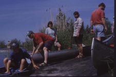 Noch schnell Erik seine morgendlich Prozedur - das Auffüllen seines mobilen Miniaquariums -, und es konnte auf die nächste, 17 Kilometer lange Etappe nach Verchen gehen. Die Peene, ein gemächlich dahinfließender Wiesenfluß, beherbergt in der verschilften Uferzone und dem größten Niedermoorgebiet Deutschlands eine Vielzahl von bundesweit seltenen Tieren, darunter auch den Biber. Der Streckenabschnitt, den wir paddeln, gehört zum Naturpark Mecklenburger Schweiz und Kummerower See. Der nun zunehmende Schiffsverkehr bereitete uns Neuruppinern ein wenig Probleme. Ständig kamen wir durch die Wellen aus dem Rhythmus und versuchten sie, so gut es ging, zu schneiden. Der Wasserwanderrastplatz lag genau an der Stelle wo die Peene in den Kummerower See fließt. Abendessen gab es in einer Dorfgaststätte. Die Wirtin war etwas außergewöhnlich. Sie fragte jeden Gast nach seinem Namen, hatte große Mühe die Bestellung aufzunehmen und servierte jedes der 31 Getränke einzeln (???). Diese Art von Erlebnisgastronomie war uns allen bislang unbekannt, und wir hatten kein gutes Gefühl was das Abendessen angeht. Doch in diesem Fall wurden wir positiv überrascht. Schnell wurde uns eine reichliche Mahlzeit serviert. Ihre lustige Art später beim Bezahlen machte die Wirtin am Ende doch noch richtig sympathisch. Den Abend verbrachten wir wieder in geselliger Runde bei Bier und Wein. Die Lieder, die gesungen wurden, begleitete Frank auf der Gitarre. Etwas später schon im Zelt liegend, hörte ich noch die Gespräche der Nachtschwärmer, die mich so nach und nach einlullten.