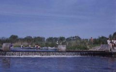 Wohl gestärkt ging es ohne Probleme ins Tagesziel nach Nehringen. Eine alte Holzklappbrücke kündet das nahe Ziel an. Jugendliche feiern am Strand mit lauter Musik Himmelfahrt. Uns steigt der Duft eines sich am Spieß drehendes Schweines in die Nase. Doch die leckere Speise ist nicht für uns bestimmt. Statt dessen müssen wir unsere Boote vor der schon angedröhnten Meute schützen und die vollgepackten Boote ca. 150 Meter bergauf in die dortige Jugendstätte befördern. Schnell ist das Zeltlager aufgebaut. Ein Imbisswagen macht durch uns guten Umsatz an Eis und Bier. Ein einheimischer Hobbysammler führte uns durch den Ort und zeigte uns die Heimatstube. Er war so richtig begeistert. So eine große Gruppe hatte sich schon lange nicht mehr für den Ort interessiert. Man hatte das Gefühl, dass er jedes seiner wohl über 1000 Exponate einzeln erklären und vorstellen wollte.
