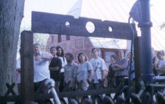 Ich komme mir vor wie die Fleischeinlage in einer braunen Brühe. Aber der Schein trügt. Das Wasser war nicht so dreckig wie es aussah. Auf jeden Fall war das Schwimmen eine willkommende Abkühlung. In der Ferne erkennen wir schon die Kirchturmspitze von Demmin. Ehe wir aber dort ankommen, sind es noch geschätzte 12 Tageskilometer. Da wir noch genügend Zeit haben, legen wir noch eine weitere Badepause ein. Dann sind wir auch schon am Ende der Trebel, und biegen flußaufwärts in die Peene ein. Ein wahnsinniger Bootsführer fährt volles Tempo an uns vorbei. Die großen Wellen schlagen seitwärts an unser Boot ein, schwappen über und bringen uns fast zum Kentern. Doch wir hatten Glück. Nur Wasserschaden. In Demmin wurden wir wieder mit Musik begrüßt. Ein Rummel, direkt am Wasser liegend lockt mit lauter Musik. Im Seglerhafen waren die Zelte routinemäßig schnell aufgebaut. Bis auf Wolfgang, der Zeltwache übernahm, waren alle zum Einkaufen in die Stadt gegangen. Nachschub an Getränken und Verpflegung besorgen. Am Abend wurde gegrillt und für diejenigen, die kein Fleisch mochten wurden leckere Salate bereitet. Auf der gegenüberliegenden Seite des Flusses beobachteten wir ein Tier, das mit dem Nestbau beschäftigt war. Nach langer Diskussion, welches Tier es wohl war, legten wir uns auf einen Nerz fest. Der gemütliche Abend wurde von der Beschwerde einer benachbarten Zeltinsassin gegen Mitternacht abgebrochen.