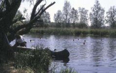 Am Morgen strahlte es uns gleich zweimal entgegen. Zum einen schien die Sonne und zum anderen strahlte das Gesicht von Julia, die über Nacht angereist war. Damit Omo und Agnes mal in Ruhe frühstücken konnten, spielen Lydia und ich mit ihrer 13 Monate alten Tochter Aziza. Immer wieder: Rutsche rauf - Rutsche runter. Die kleine strahlte über beide Ohren. Wolfgang dagegen saß mit schmerzverzehrtem Gesicht beim Frühstück und ärgerte sich über seinen Sonnenbrand. Inzwischen hatte Erik sein mobiles Miniaquarium mit zahlreichem Unterwassergetier aufgefüllt. Es konnte also weiter gehen. Zurück blieb nur noch das qualmen des Lagerfeuers in seinen letzten Zügen. Dieser Tagesabschnitt von 21 Kilometer Länge hatte im wesentlichen den gleichen Charakter wie der des Vortages. Sumpfige Wiesen und Wälder. Großzügige Seitenarme, zahlreiche Biberburgen, Schlangen, seltene Vögel und vieles mehr gab es unterwegs zu sehen. An einer günstigen Stelle machen wir Rast. Zum erstenmal gehen wir ins Wasser baden.