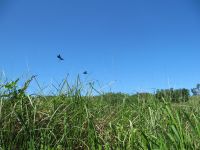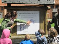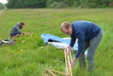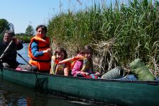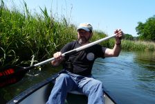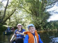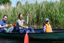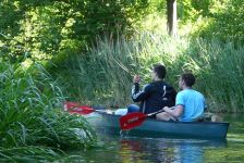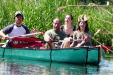 Am nächsten Morgen wurden wir, die Boote und unser Gepäck (offenbar zusammen mit dem Gepäck und Nahrungsmitteln für eine ganze Kompanie) mit Autos nach Zaschendorf transportiert. Die - vermutlich von Diana bestellten - Vögel hatten uns Großstädter schon Stunden vorher geweckt, so dass wir pünktlich starten konnten. Bei Zaschendorf ging's dann endlich in die gemieteten Boote, allesamt Dreier-Kanadier. Binnen Minuten war man umgeben von einer stillen Wiesen- und Schilflandschaft. Alex und Anne, unsere Faltboothelden mussten allerdings erst ihr Faltboot entfalten, bevor auch sie lossegeln konnten. Nach kurzer Zeit überqueren wir den Mickowsee und können gleich vier miteinander jagende Seeadler beobachten. Kilometerlang windet sich die Warnow durch stille Wiesen, Sümpfe und Röhrichte, sehr ruhig, grün und entspannend. Nach 9 km erreichen wir Alt Necheln und machen eine Kaffee- und Kuchenpause im elegant restaurierten alten Gutshaus, das von der ersten Architektin Deutschlands, Emilie Winkelmann, entworfen wurde. Indem sie die Kellnerin auf ihrem Weg nach draußen abfängt, sichert sich Angelika das letzte Stück Blaubeerkuchen vor dem auf der Terrasse aufgeschlagenen Rest der Truppe. Kurze Zeit später ist der Kuchen komplett aufgegessen. Alle, die nichts abbekommen haben, kriegen Kekse auf Kosten des Hauses. In der Naturschutzstation nebenan bekommen wir eine Führung zu Lebensweise und Schutz des auch an der Warnow wieder vertretenen Bibers. Im Wettstreit Baum gegen Biber hat eindeutig der Biber die Nase vorn.