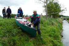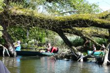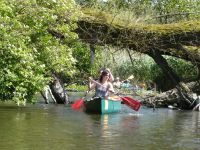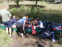 Am nächsten Morgen gibt es zwar keine Brötchen, dafür aber endlich Sonne. Der Freitag wird sonnig und wir endlich warm. Wieder winden wir uns beschaulich durch Wiesen und Weiden und nähern uns der Stelle, an der die Warnow sich ein Bett durch die Endmoräne der letzten Eiszeit geschaffen hat. Zuerst genießen wir von einem Aussichtspunkt den tollen Blick auf eine Herde Sternberger Schafe und das grüne, hügelige Sternberger Land. Auf dem Weg zum Durchbruchstal hat jemand eine große Menge Wolle verloren, was Wiebke und mehrere andere Teilnehmer zur Wollballschlacht inspiriert. Auf einer Brücke über die Warnow mitten im Herzen des Durchbruchstals besichtigen wir das von uns zu meisternde, mit Steinen und starker Strömung versetzte Flussbett und beobachten andere Paddler bei ihren mehr oder weniger gelungenen Versuchen da elegant durchzukommen. Mit unserer Erfahrung bewältigen wir die Stelle anschließend mühelos. Alex und Anne, die ihr Faltboot lieben, schieben lieber. Um auf Nummer sicher zu gehen, schieben sie auch dann noch als ihnen das Wasser schon wieder bis zur Brust reicht. Eine tückischer Stein kann überall lauern, man weiß ja nie. Dass der Fluss tatsächlich tückisch sein kann, müssen Katrin, Fine, Joni und Heiko ein paar Flussbiegungen weiter erfahren: sie kentern an einem Baumhindernis, binnen Sekunden läuft das Boot mit Wasser voll und dreht sich. Glücklicherweise ist es nur eine Schrecksekunde. Durch die besonnene Reaktion und beherzte Hilfe anderer Paddler nimmt keiner Schaden und auch alles Gepäck, mitsamt der Kuschel-Schildkröte, kann geborgen werden, wenn auch nicht mehr ganz trocken…