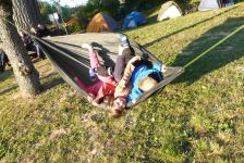 Gemächlich schippern wir weiter bis es kurz vor dem Rastplatz in Weitendorf nochmal spannend wird: eine Steinstufung und das Gefälle sorgen für Wildwasserfeeling, aber alle kommen unbeschadet durch. Auch in Weitendorf gibt es wieder ein Lagerfeuer, vor allem aber Bäume, an denen man eine Hängematte aufhängen und sich so richtig geil austoben kann, wenn man Kind ist oder geblieben ist.