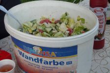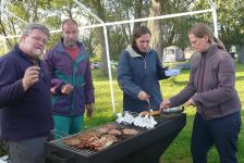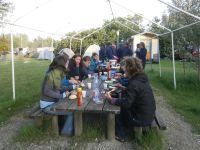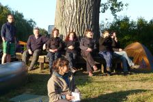 Wolfgang, der uns mit seinem Auto die ganze Zeit hilfreich zur Seite stand, hat bereits alles für unser Grillfest besorgt. Steaks, Bratwürste und vegetarische Alternativen brutzeln auf dem Grill, Salat steht eimerweise zur Verfügung. Das Abendrot ist gratis, und um das Lagerfeuer wird bis weit in die Nacht gefeiert und gelacht. Nachts ist der Biber auf dem Rastplatz aktiv. Mehrere Teilnehmer berichten übereinstimmend gehört zu haben, wie mehrere große Bäume im Laufe der Nacht lautstark umgesägt wurden. Zu sehen ist am Morgen nichts...