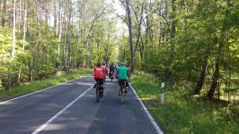 Nach kurzer Begrüßung und Pause ging es recht flott weiter bzw. für uns los, wir reihten uns weiter vorn ein, um unsere beiden Apricusse zu unterstützen und Windschatten zu spenden, da wir entsprechend ausge­ruhter waren. Die Fahrt fast ohne Autos, bei Morgensonne und mit einem Trupp Radlern war echt toll. Der nächste Stopp in Borkheide war auf den Regionalexpress abgestimmt (RE7) und es kamen noch ein paar Leute aus Richtung Dessau bzw. Berlin dazu. Für diejenigen, denen die ganze Strecke zu viel ist, aber die noch einen Hauch des Abenteuers mit­erleben wollen, sind die ~20km mit Apricus von hier bis Werder ein schöner Einstieg (kleiner Tipp ;)).